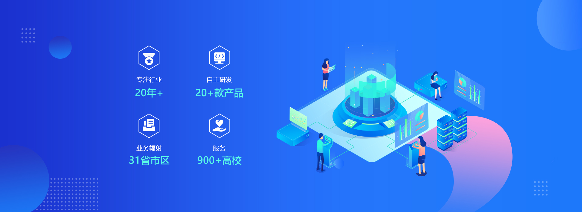 自主研發了教學微服務平臺、研究生綜合管理平臺、職業院校質量管理信息平臺、本科教學質量保障平臺、智慧校園信息平臺、一站式學生工作數字化平臺、智慧后勤綜合管理平臺等20多款產品
